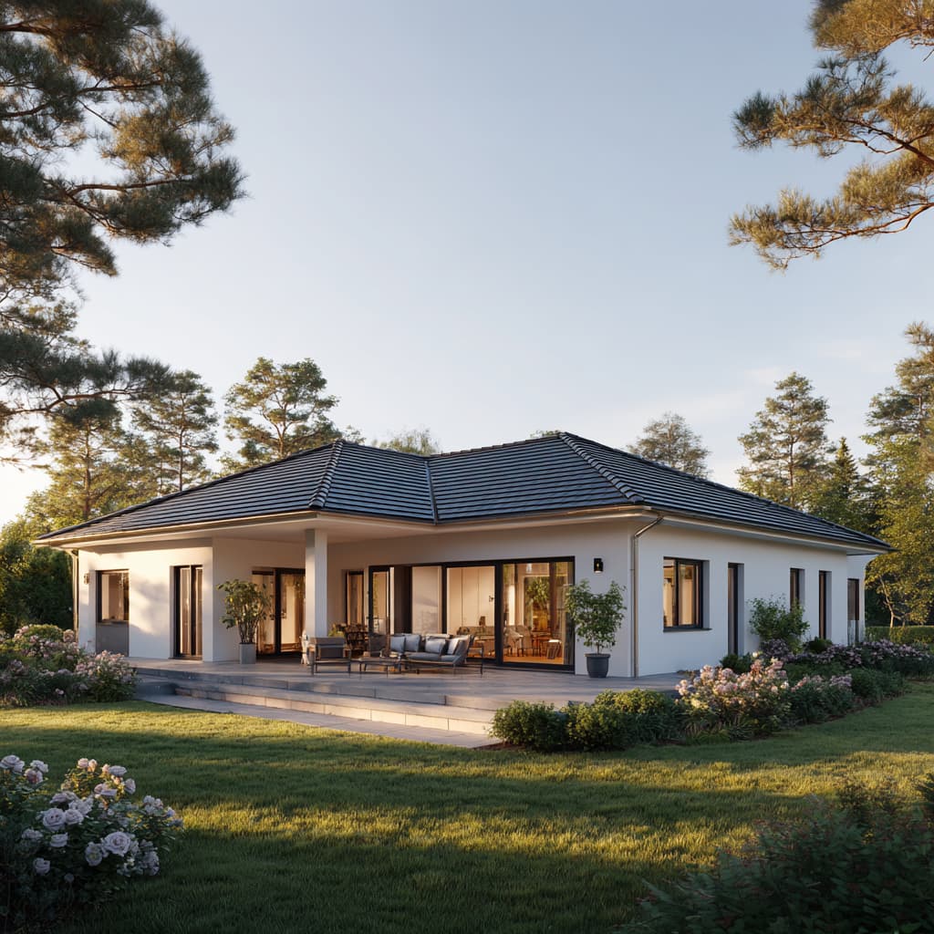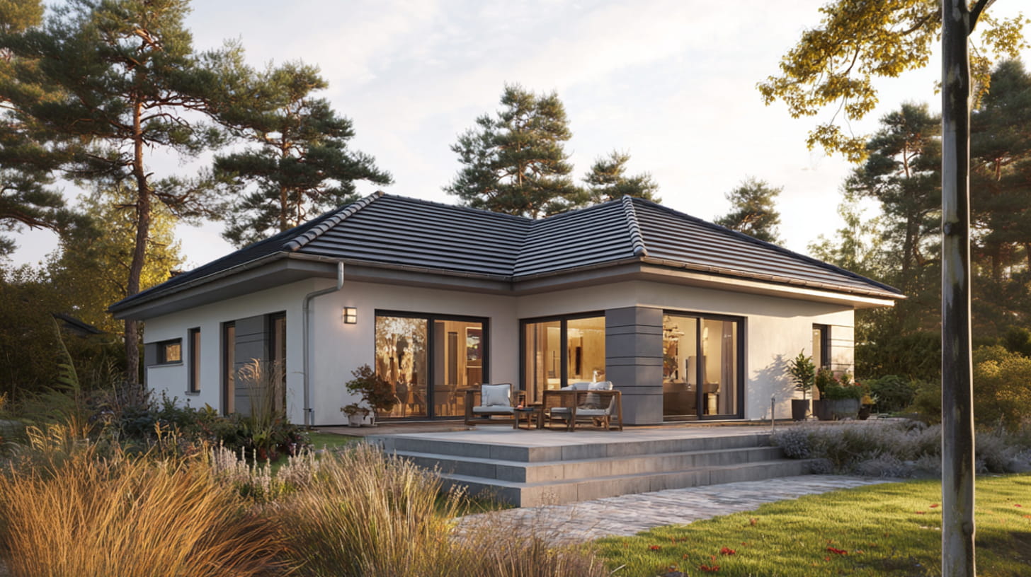 Bungalow mit klassischer Dachform, bodentiefen Fenstern und offener Terrassengestaltung.