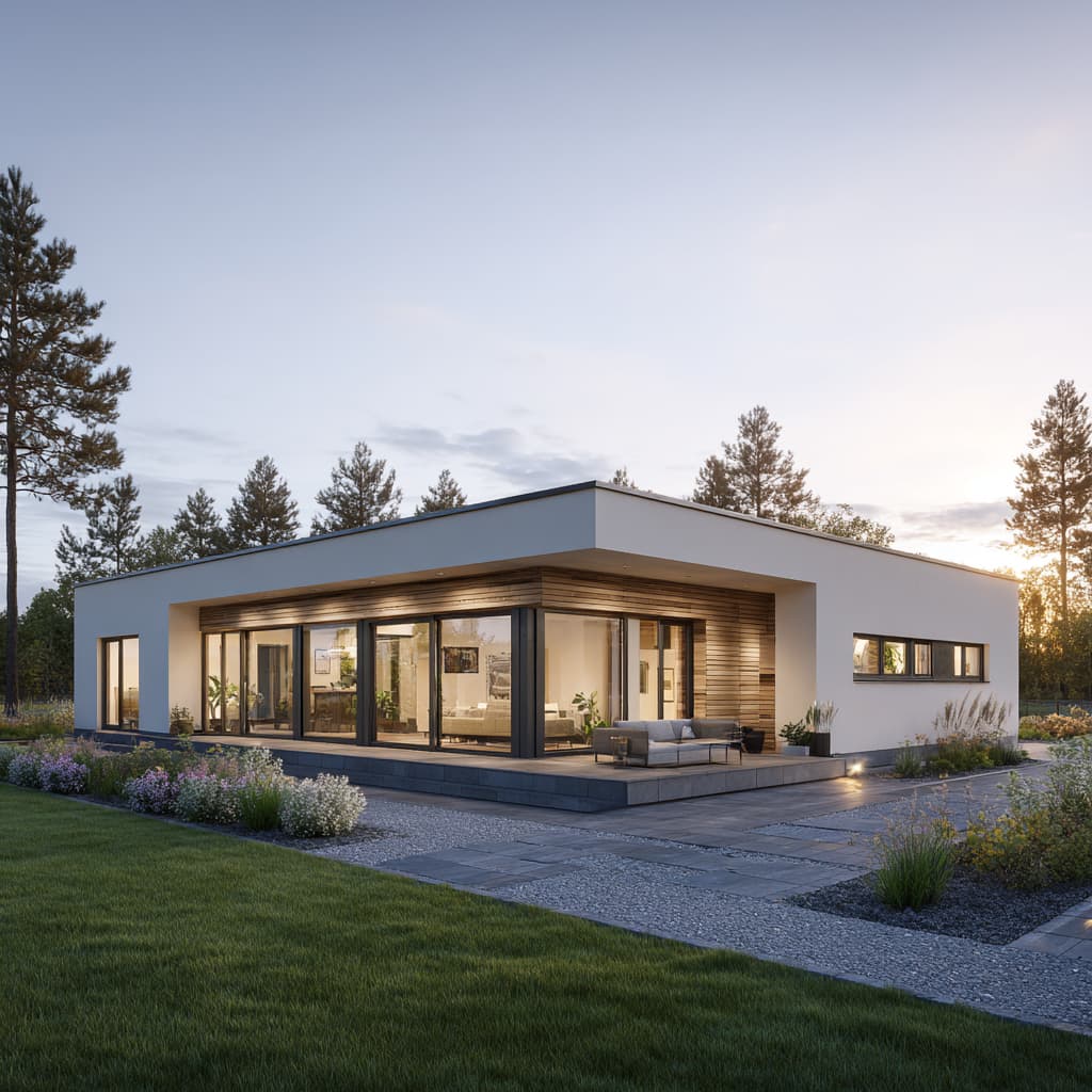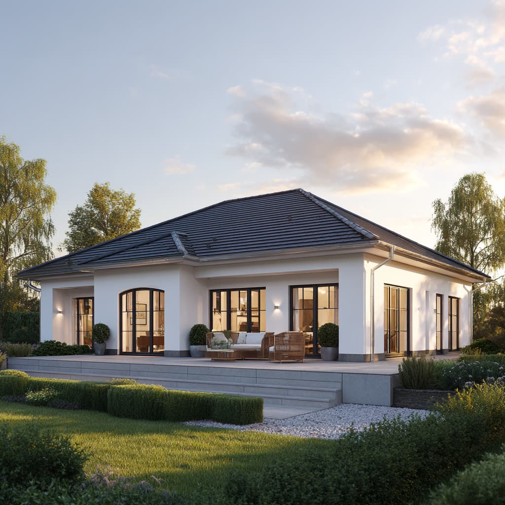 Weil die BungalowManufaktur Innen‑ und Außenraum gemeinsam denkt, werden architektonische Elemente des Hauses im Garten weitergeführt: die Material- und Farbwahl, Proportionen und Sichtachsen orientieren sich am Baukörper. Die frühe Einbindung eines Gartenarchitekten oder Landschaftsplaners in die Hausplanung stellt sicher, dass Gartenwege, Terrassengröße, Pflanzflächen und Zäune ideal aufeinander abgestimmt sind und spätere Umplanungen vermieden werden.